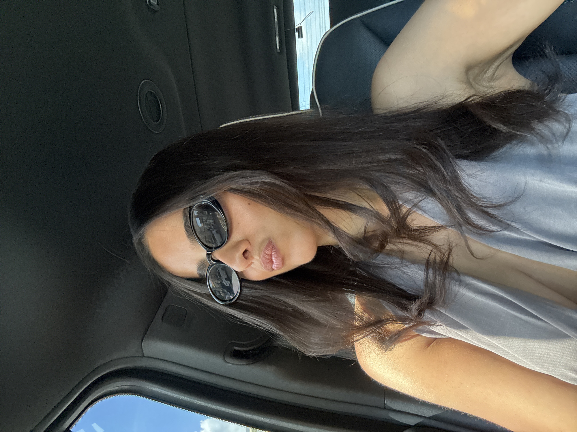 A woman with dark hair and sunglasses is in the driver's seat of a vehicle. The vehicle's interior is dark, with a black headliner and seats. Outside the window, the sky is visible. The location is not specified in the image, and no elements provide identifying evidence for Calabasas, United States of America.