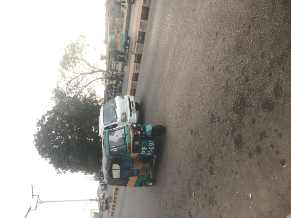 A daytime street scene in Katon Rikkos, Nigeria, features an asphalt road with vehicular traffic. In the foreground, a teal, yellow, and black three-wheeled auto-rickshaw, marked "PT 15695," is positioned facing slightly right. Behind it, a white compact van is present in the same lane. To the right, a low concrete median barrier separates traffic. Beyond this barrier, several motorcycles are visible, some with riders, alongside other indistinct vehicles and at least one pedestrian walking on the far right. Dense green foliage from large trees dominates the background against a hazy, bright sky. A modern street light pole, equipped with solar panels, is visible on the far left. The asphalt road surface exhibits dark stains.
