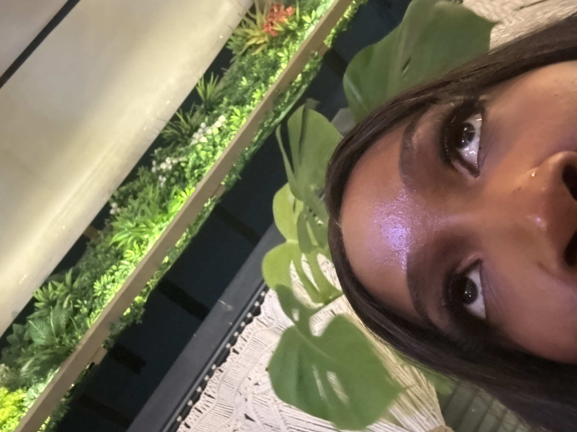 close-up of a person's face, likely female, with dark hair and brown skin. The individual is positioned at an unusual angle, looking upwards and to the side. The skin appears shiny, possibly due to lighting or moisture. The background features a mix of elements: A white macrame material is partially visible, large green monstera leaves are present, and there is a long planter filled with various green plants, including small white flowers. Based on the question's prompt mentioning the city of Itirin, Nigeria, we assume the picture was taken in this location, but there is no visual evidence from the image to confirm this information. No specific actions, interactions, or subjects beyond the individual and the background elements can be deduced from the image.