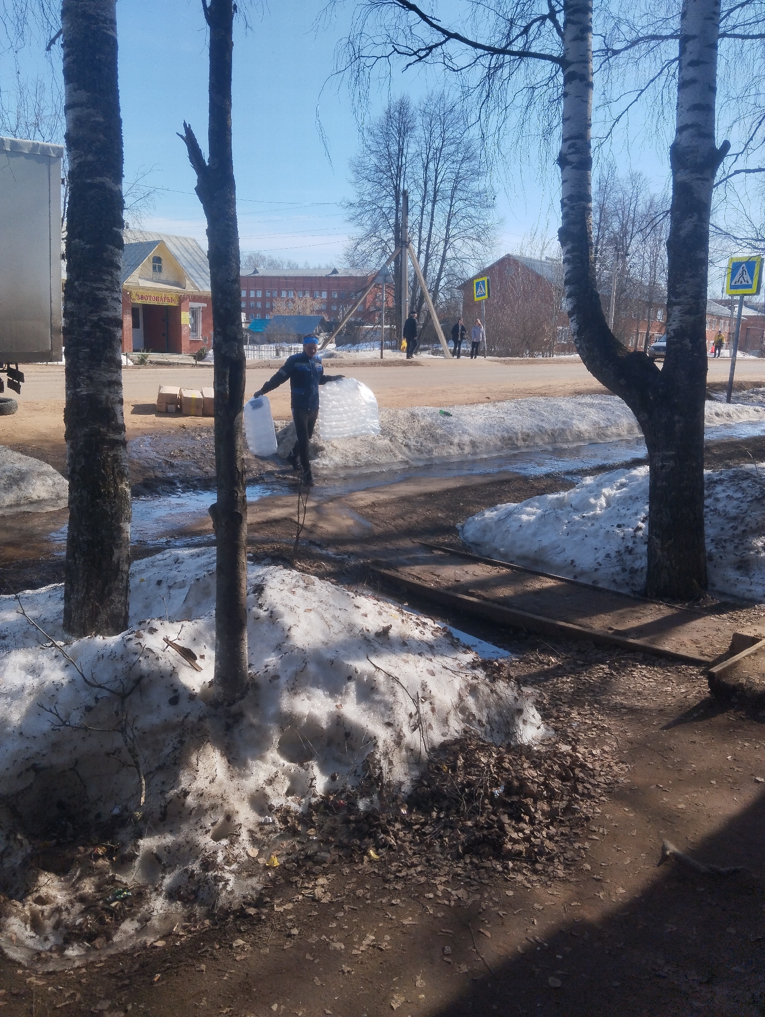 The image depicts a street scene in what appears to be the city of Krasnogorskoye, Russia. The ground is covered in patches of melting snow and mud, indicating a transition season, likely spring. Bare birch trees are positioned along the street, framing the view. A man is carrying a large, translucent plastic bag, possibly filled with trash or recycling, across the street. In the background, there are buildings of different styles, including a two-story yellow and red building with the text "ФОТОТОВАРЫ" (Photographic Goods) visible, and a larger brick building further back. A pedestrian crossing sign is visible on the right side of the street, and several people are walking on the sidewalk in the background. A triangular support structure for power lines is visible. The overall impression is one of a typical urban street in a transitional season with evidence of human activity.