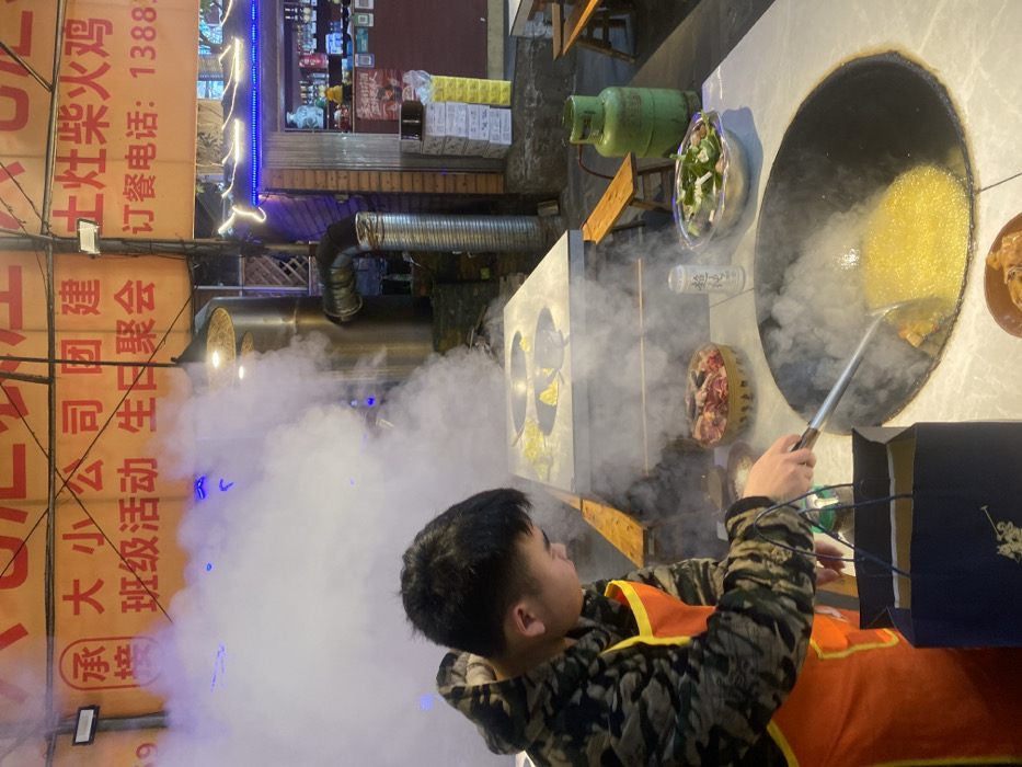 A man in an orange vest is cooking in a large wok. Smoke billows around him and the cooking station. On the table is a green propane tank, a bowl of vegetables, a canned drink, and a plate of raw meat. Chinese characters appear vertically on a nearby sign advertising "Earth Stove Firewood Chicken" with contact information.