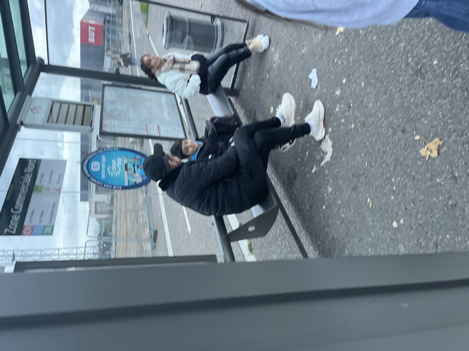 The image displays a bus stop shelter situated in the Zone Commerciale Nord of Vendenheim, France, under an overcast sky. Three individuals are seated on a grey metal bench within the shelter, with a fourth person partially visible in the immediate foreground. On the left side of the bench, an adult male, wearing a black puffer jacket, black pants, a black baseball cap, and light-colored sneakers, sits with his left leg crossed over his right. He is positioned facing slightly right, looking towards a young boy seated immediately to his right. The boy, estimated to be between 5 and 8 years old, wears a blue jacket over a dark top and dark pants, and is looking forward. Further to the right on the same bench, an adult female is seated. She wears a white puffer jacket, dark pants, light-colored footwear, and a light-colored scarf around her neck. Her hands are placed in her pockets, and she is looking to her right, away from the other two individuals. In the bottom right foreground, the torso and part of the leg of a fourth person, wearing a light-colored hoodie and blue jeans, are visible. The bus shelter itself features a transparent roof and back panel, supported by grey columnar structures. A sign above the bench clearly indicates "Zone Commerciale Nord" and lists bus routes C9, 71, and 74. A black cylindrical trash receptacle stands behind the adult female. The ground beneath and around the bench is asphalt, with two small crumpled white pieces of paper and several scattered brown autumn leaves present. In the background, beyond an asphalt road, a commercial area is visible, featuring large buildings, one of which is marked with the red text "BUT." Fencing consistent with construction or undeveloped land is also visible in the mid-ground.