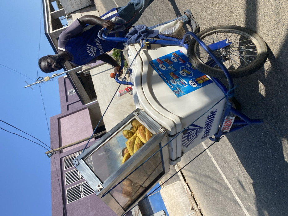 - "An adult male, with a beard and short dark hair, wearing a blue FanMilk branded t-shirt, dark trousers, and dark sandals, is pushing a three-wheeled vending cart on a paved road" by FM-b79C12, licensed under CC BY 4.0
