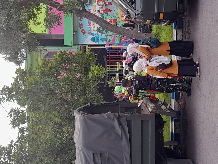 A group of children and adults stand in front of a brightly colored building, possibly a school. Some of the adults wear headscarves and carry backpacks, while a person in military uniform stands among them. The group seems to be gathered near a military vehicle. A tree obscures some of the building, and another vehicle is parked further down the street. The scene appears to be taken outdoors, potentially on a street adjacent to the building.
