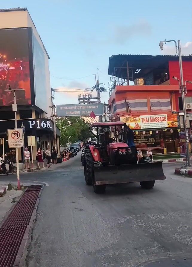 A red tractor pulls a long line of jet skis through a street in Chaweng Beach, Thailand. The tractor has a front blade attachment. The street is lined with buildings including businesses such as a Thai massage parlor and a bar labeled P168. Several pedestrians are standing on the sidewalks watching the procession. The sky is blue with some clouds.