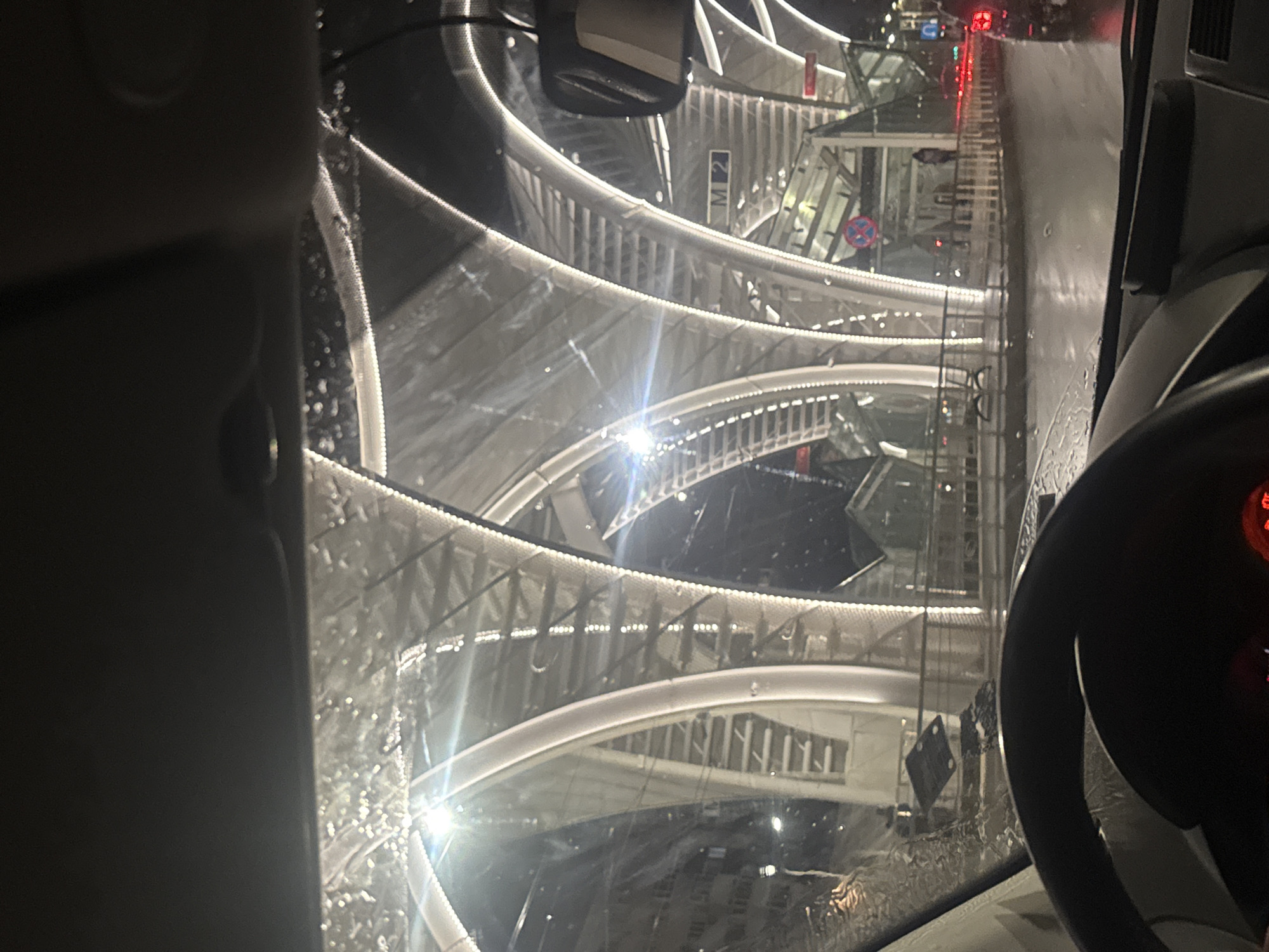 view through a car windshield, likely at night in Bucharest, Romania. Visible through the windshield is Pasajul Basarab, an elevated road and pedestrian crossing. The passageway is illuminated with white lights. There are traffic lights visible in the distance. The windshield has water droplets on it. The interior of the car is visible, including parts of the dashboard and steering wheel. There are signs and buildings visible along the street.
