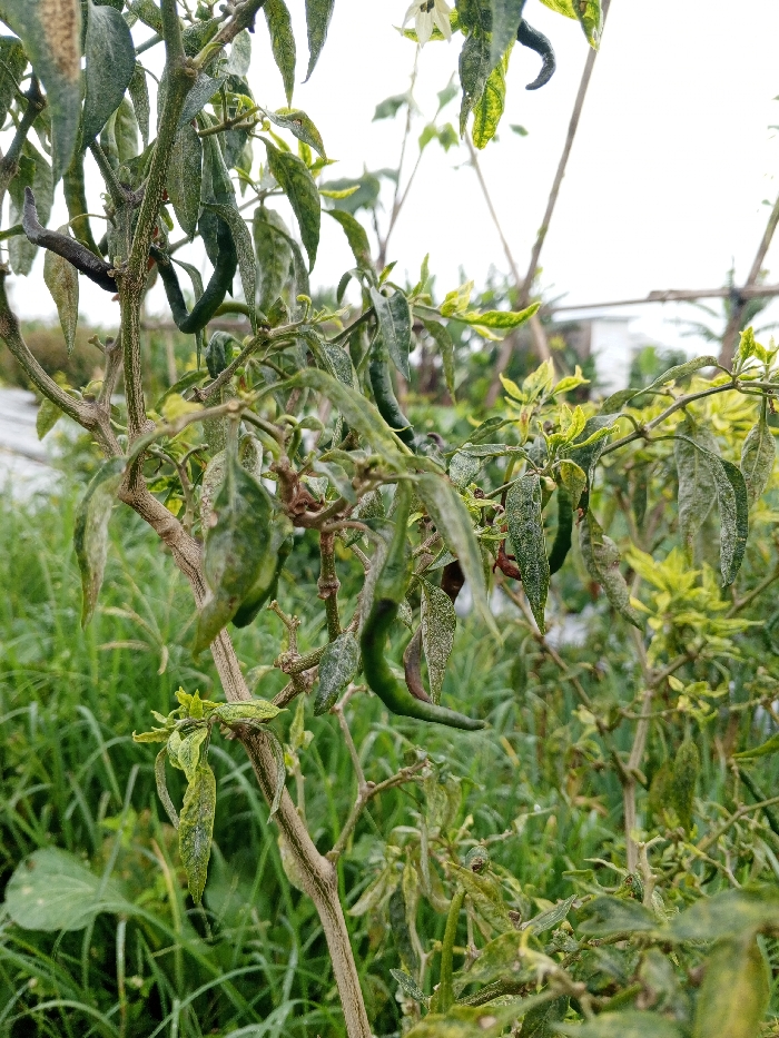 A pepper plant with green peppers exhibits unhealthy leaves. Some leaves display yellowing, curling, and signs of a possible infestation or disease, like powdery mildew. The plant is surrounded by tall green grass, and other vegetation is visible in the background. A structure, possibly a building, appears in the distance on a cloudy day.