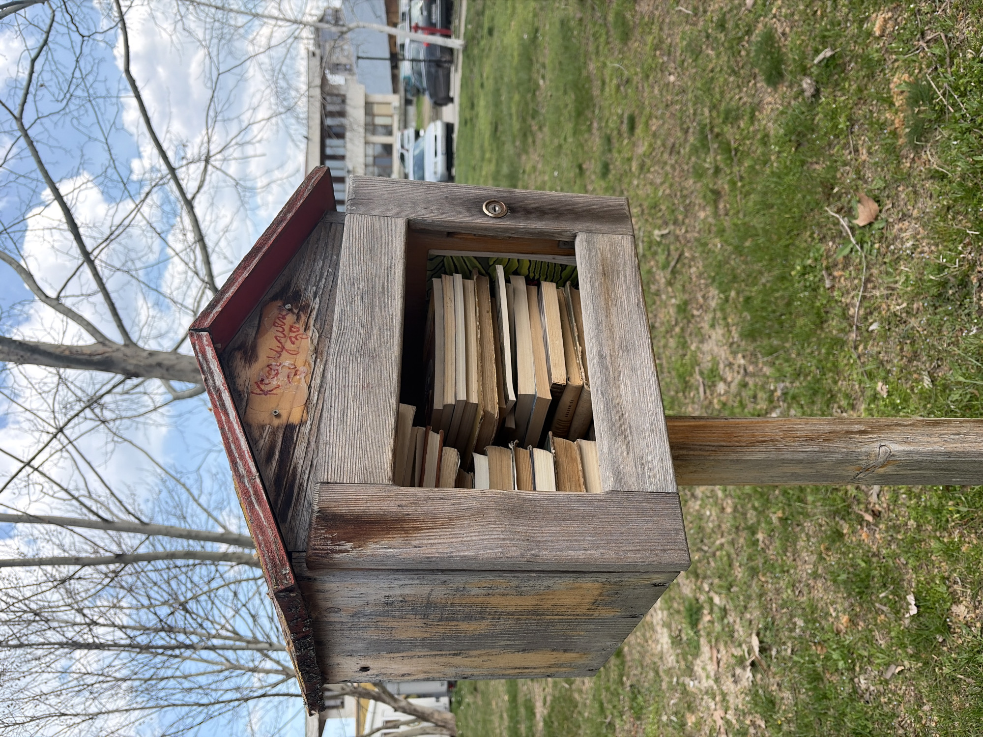 - "An outdoor, eye-level shot captures a weathered wooden little free library box standing on a single post within a grassy area in Lom, Bulgaria" by FM-82mPe2, licensed under CC BY 4.0