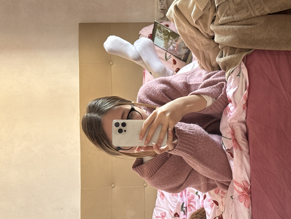 The scene depicts an individual lying prone on a bed within an indoor setting in L'hospitalet De Llobregat, Spain. The person, possessing visible light brown hair and wearing black-rimmed glasses, is dressed in a pink knitted sweater over a white long-sleeved shirt. Both hands, with manicured fingernails, hold a silver-colored smartphone featuring a prominent triple-lens camera array, positioned in front of the face to capture a mirror selfie, thereby obscuring the upper facial features. The individual's lower legs are raised, with feet crossed at the ankles, encased in white socks with visible dark branding. The bed consists of a dark pink fitted sheet and a pink duvet patterned with white and pink flowers and red cherries. A light beige, button-tufted upholstered headboard is visible behind the individual. To the right of the person, an open silver laptop rests on the bed, displaying vibrant, colorful content on its screen. Adjacent to the laptop, a pile of light brown fabric items, resembling blankets or towels, is present. The background wall is a plain light beige, and a white European-style electrical outlet is mounted on the wall to the right.