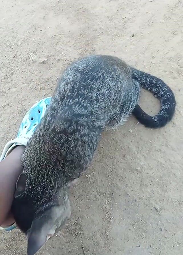 The camera looks down from above at a gray tabby cat rubbing against a person's left leg. The person is wearing a blue and white tie-dye Croc-style shoe. The cat is curled around the person's leg, and the person is wearing dark pants. The ground is dirt and sand. The cat meows. The cat continues to rub and stretches its body. The cat then moves away from the person's leg.