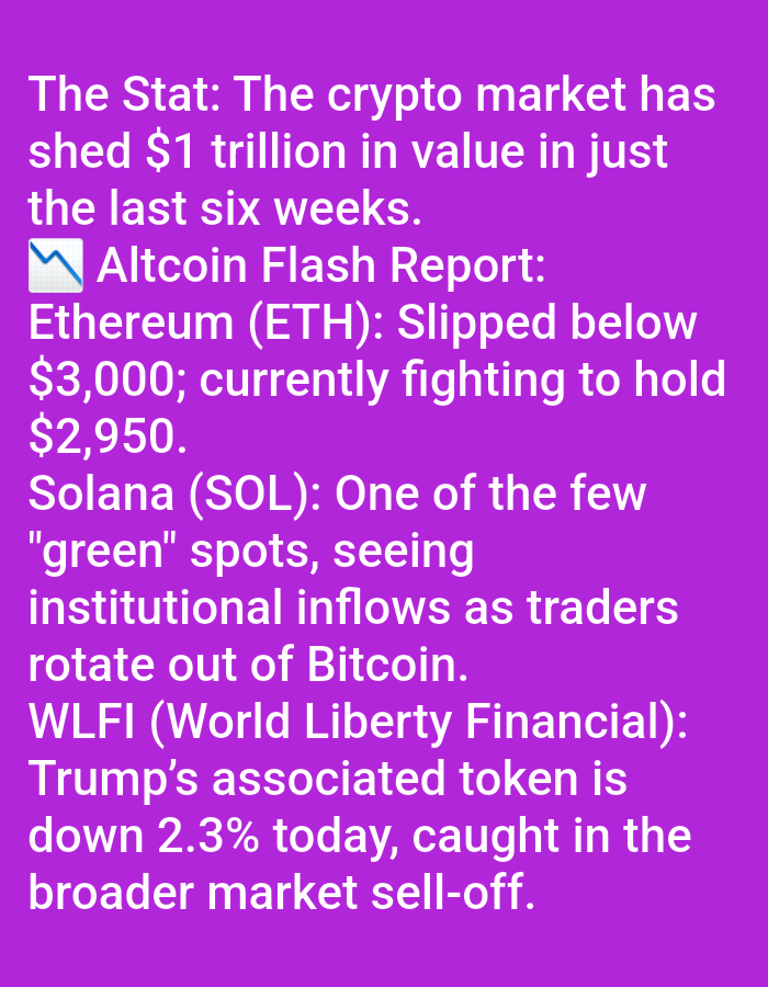The crypto market has lost $1 trillion in value in the last six weeks. Ethereum has dropped below $3,000 and is struggling to stay above $2,950. Solana is experiencing institutional inflows as traders move away from Bitcoin, making it one of the few "green" spots. The World Liberty Financial token, associated with Trump, is down 2.3% today, affected by the broader market sell-off.