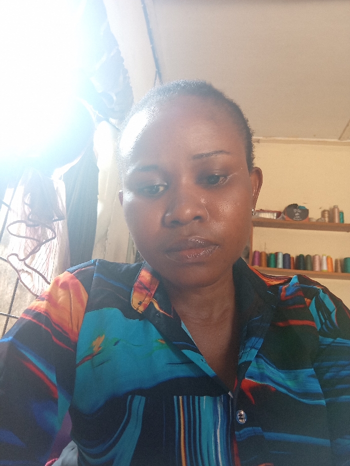 The scene is an indoor location within an establishment in the city of Unknown, Unknown. An adult female with short, dark hair is depicted from the waist up, looking slightly downward and to the right of the frame. She wears a collared shirt featuring an abstract, multicolored pattern in blue, black, orange, and white hues. Her lips are glossy, and a small stud earring is visible in her left ear. To the left of the subject, a window with a dark metal grid is present, through which a strong light source emits, causing significant lens flare in the upper left quadrant of the image. Dark fabric is draped near this window. To the right, a light-colored wall displays a wooden shelf unit. The lower shelf holds multiple rows of various colored spools of thread, while the upper shelf contains several indistinct small objects. The primary illumination originates from the left side of the frame.