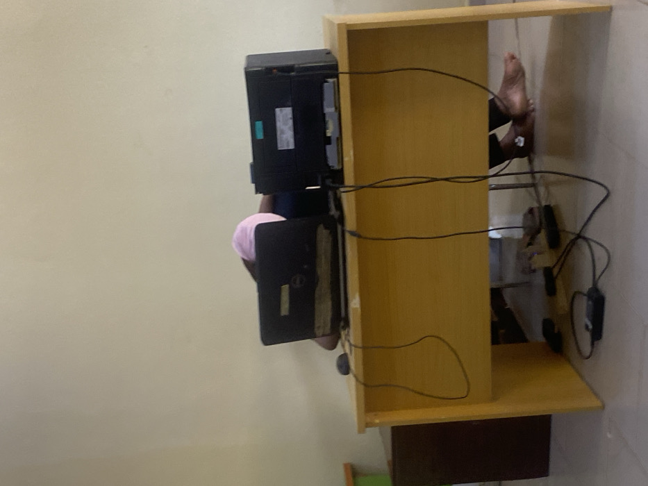 The image depicts an indoor scene in Birnin Kebbi, Nigeria. A single individual is positioned behind a light-colored wooden desk. The person wears a light pink head covering and a dark blue garment, with their head lowered onto the desk surface. An open, black Dell laptop is centrally located on the desk, accompanied by a black computer mouse to its left. To the right side of the desk, a black printer or similar electronic device is visible, featuring a light blue label on its top surface. The individual's bare feet are visible on the light-colored tiled floor beneath the desk. Multiple black electrical wires and power adapters are distributed on the floor under the desk. A dark brown cabinet is partially visible on the far left, and the background wall is a uniform light beige.