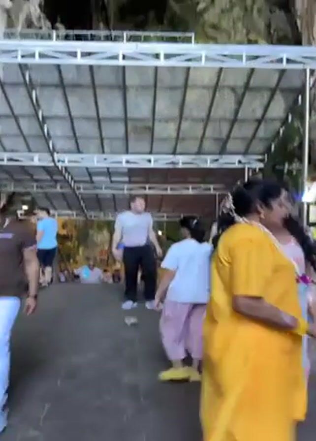 crowded indoor area, possibly a temple or tourist site, under a metal-framed roof. People are walking around, dressed in casual clothing. A woman in a yellow outfit with a garland is walking past the camera. The camera then pans upwards to show a large cave opening with visible rock formations. The cave ceiling is dark and textured. The metal-framed roof extends towards the cave opening.