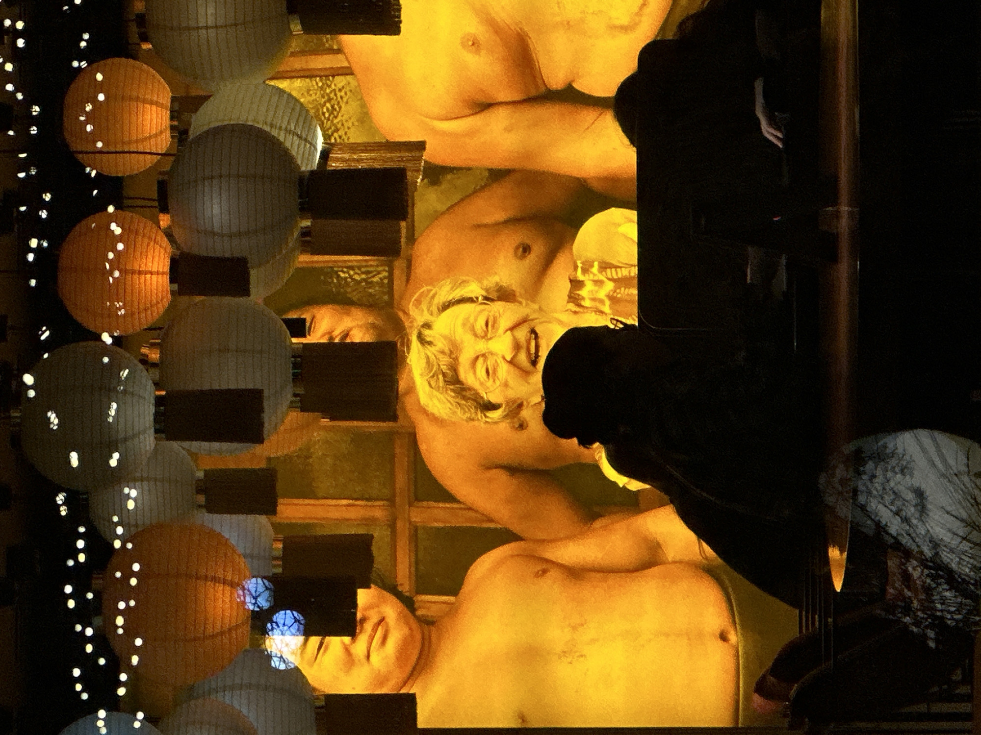 window display, potentially of an art gallery or museum, in Rostov-on-Don, Russia. Visible through the window are three nude figures reminiscent of classical sculptures. One is a smiling, blonde woman, while the other two appear to be men. The figures are interspersed with a lattice-like structure and illuminated lanterns of various sizes. Black objects, possibly parts of the window display structure or additional artwork, partially obscure the view. To the left of the display, lights hang vertically. The image appears to be taken at night, based on the ambient light.