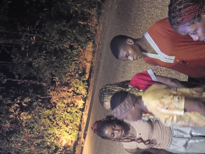 A group of five people are seen outside at night