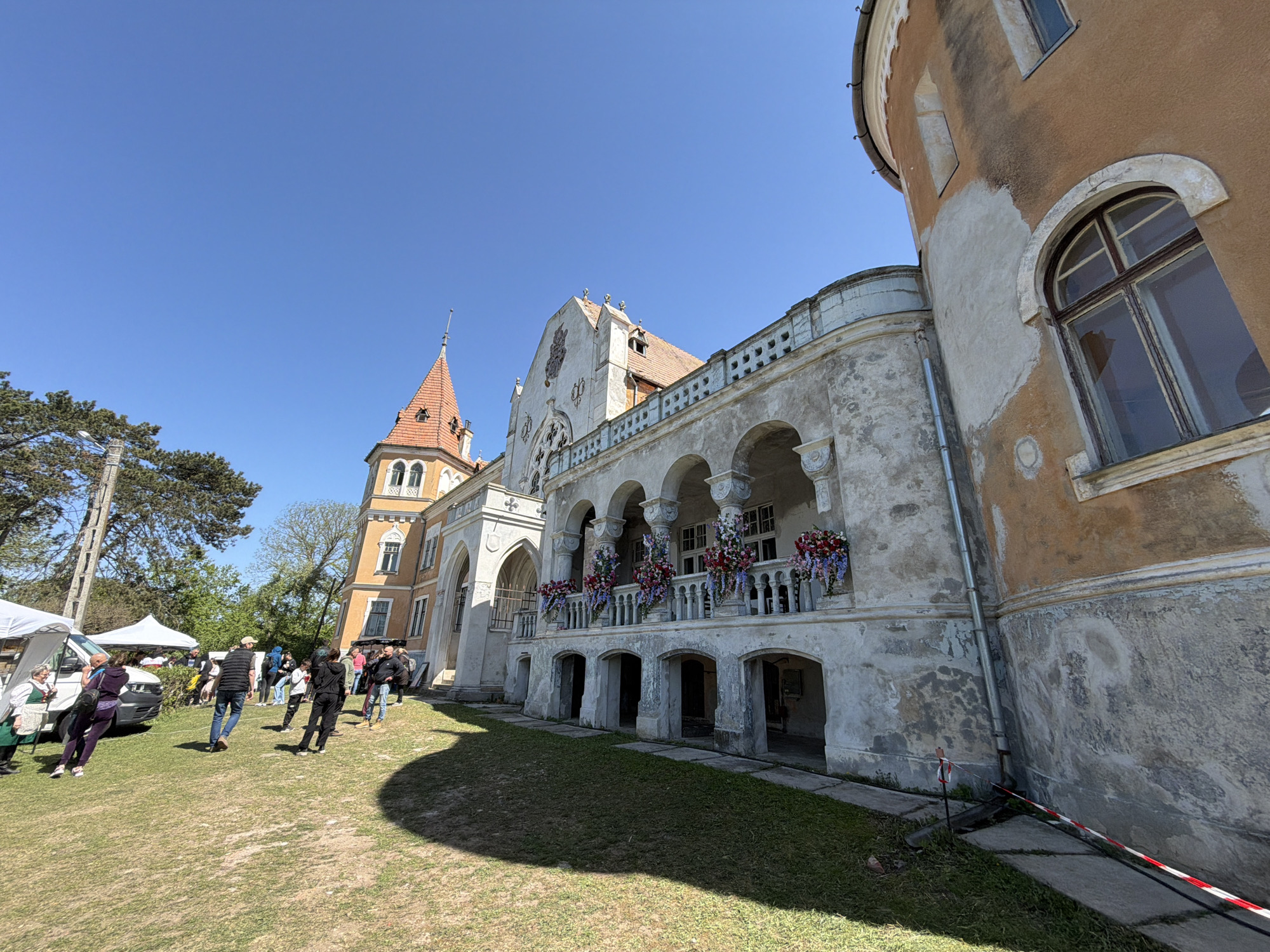 The image captures the exterior of a historic building, possibly a castle or manor, in Gaura Sângerului, Romania. The structure exhibits architectural details, including arches, balconies adorned with floral arrangements, and a tower. The building appears to be undergoing restoration, as evidenced by the weathered facade. Several individuals are present on the grounds, some interacting with vendors at tents in the background. The environment is a grassy area under a clear, bright blue sky. A red and white tape line is visible near the building's base, possibly indicating a restricted area.