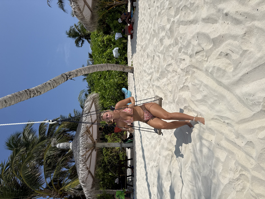 - "A woman in a bikini swings on a beach under a partly visible thatched umbrella" by FM-CYJaF3, licensed under CC BY 4.0