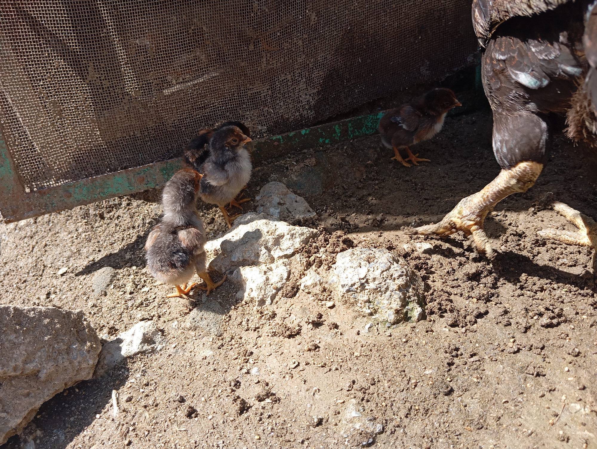 The scene depicts three chicks near a section of wire mesh and a larger chicken's leg in Lassan, Pakistan. The ground is dirt and small stones. Two chicks are close together, and the third is a short distance away, near the chicken's leg. The wire mesh is attached to a green metal frame.