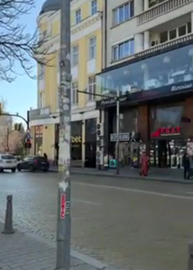 street scene on a sunny day. The camera pans from left to right, showcasing buildings with various architectural styles, including a Russian restaurant, an Allianz office, and buildings with domed roofs. Cars and pedestrians move along the street. The street is paved with light-colored cobblestones, and trees line the sidewalk. A light pole is visible on the right side of the frame.