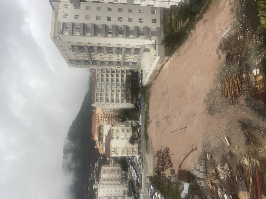 The image depicts an urban landscape in Budva, Montenegro, under an overcast sky with low-hanging clouds obscuring mountain peaks. In the foreground, a large, rectangular plot of unpaved, reddish-brown earth, characteristic of a cleared construction site, occupies the lower half of the frame. Scattered across this plot are various construction materials and debris: piles of wooden planks and beams are visible on the left and lower right, alongside stacks of what appear to be concrete blocks and various metal components. A long, dark, linear object, possibly a metal beam, lies horizontally near the center of the plot. Beyond the construction plot, in the midground, a paved street with a small circular traffic island is visible on the left, lined with numerous parked passenger vehicles. Several multi-story residential buildings dominate the midground. On the far left, a light-colored building with balconies and window shutters rises. Towards the center-left, another light-colored building with a reddish-brown tiled roof and more traditional architectural elements is present. Further to the right and appearing closer to the foreground construction plot, a tall, modern-style building with light-grey facades and grey balconies stands. Other buildings with varying roof colors are scattered across the rising terrain. The background is dominated by a large, green, tree-covered mountain range, partially enveloped by thick, white clouds or mist, suggesting damp weather conditions. No individuals are visible, and no active construction work or discernible human interactions are occurring within the frame.