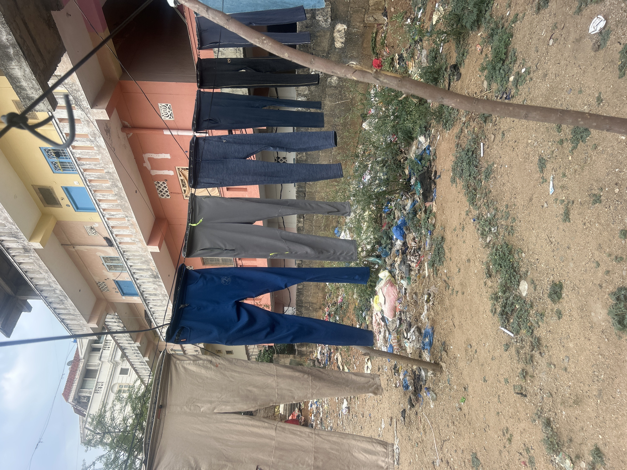 This image depicts a residential area in Puttaparthi, India, characterized by a utilitarian clothesline set against a backdrop of multi-story buildings and ground covered in refuse. Seven pairs of trousers or track pants are suspended from a dark rope, stretched horizontally across the frame and supported by slender wooden poles partially visible on the left and right. From left to right, the garments are light beige, royal blue, dark grey, patterned dark blue, dark blue, black with a vertical stripe, and light blue. The immediate foreground consists of dry, reddish-brown earth with sparse patches of green weeds and scattered small stones and white paper debris. Beneath the clothesline, the ground transitions into a concentrated area of miscellaneous refuse, including numerous plastic bags (blue, white, pink), plastic bottles, and other unidentified waste, interspersed with more robust green vegetation. In the background, a two-story residential building dominates the view. The lower level is painted peach, featuring a concrete balcony with vertical balusters, a blue door, and blue-framed windows. The upper level is yellow, also presenting a concrete balcony and blue windows. To the left of this building, a taller, white structure with multiple balconies and a reddish-brown tiled roof is partially visible. The sky above is overcast, and thin black wires, likely electrical, are visible traversing the upper portion of the frame. No individuals are present in the scene.