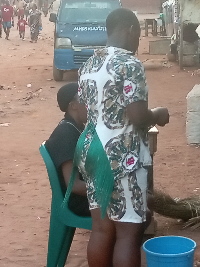 A person in a matching shirt and shorts with a unique pattern stands facing away from the camera. A person sits in a green plastic chair partially obscured. A blue vehicle with the word "MISSIONAR" is visible in the background, along with a few people walking on a dirt road. A blue bucket is in the foreground to the right. Debris litters the ground.