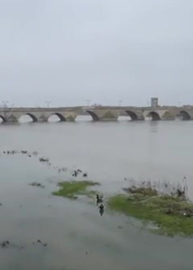stone bridge with multiple arches spanning a wide river on a gray, overcast day. The water is high, flooding some of the nearby vegetation. Several ducks are visible in the flooded area near the riverbank. The camera pans slightly to the right, revealing a small town on the far side of the river. There is no sound in the video.