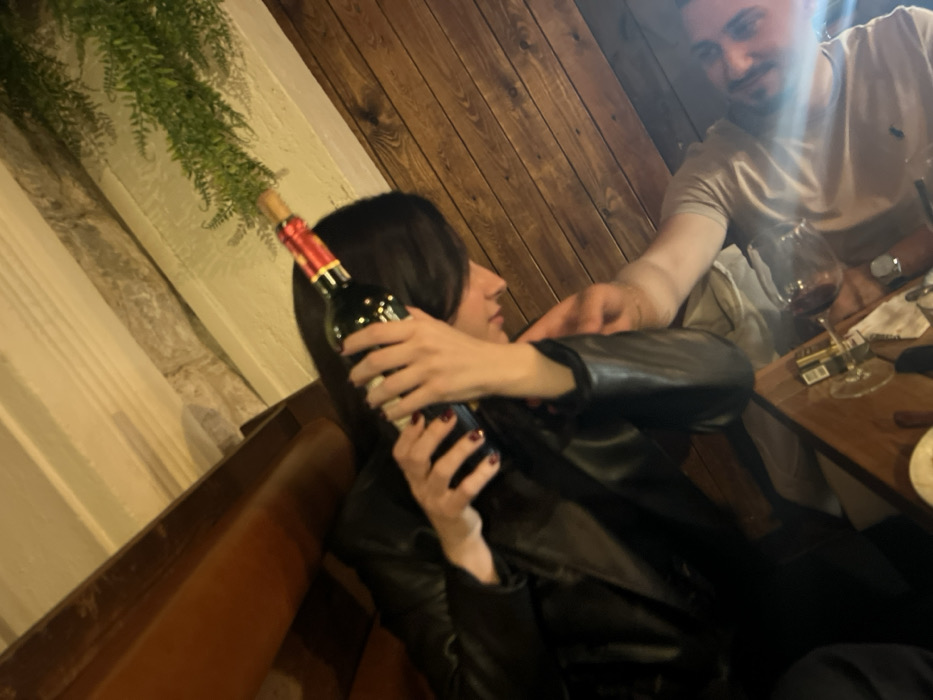 A woman in a black leather jacket holds a wine bottle close to her face. A man sits at a table next to her, a wine glass nearby. The table also holds what appears to be cigarettes and a lighter. Wood paneling is visible in the background, as well as a green plant hanging from above. The scene appears to be in a restaurant or bar.