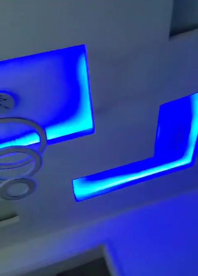 ceiling with recessed lighting that changes color between green, red, and blue. A modern chandelier consisting of interlocking white circles hangs from one of the recessed areas. Other recessed portions of the ceiling are visible, some with white light and others with no light. The video is shot from a low angle. The room appears to be indoors.