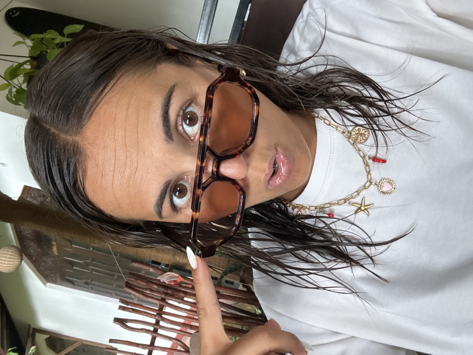 A forensic depiction of an adult female in Nilwella, Sri Lanka, captured in a close-up, selfie-style image. The subject has wet, dark brown hair with a center part, wide brown eyes, and a slightly open mouth revealing glossy lips. Her forehead exhibits horizontal lines. She wears a white crew-neck t-shirt and a gold-colored chain necklace featuring multiple charms: a starfish, a pink heart, red chili pepper-shaped beads, and an embossed circular disc. A gold stud earring is present on her right ear. She wears oversized, tortoise-shell framed sunglasses with amber lenses, resting on her nose, allowing her eyes to be visible above the frames. Her left index finger, tipped with white nail polish, is touching the right temple of the sunglasses. The background shows an outdoor or semi-outdoor environment with a light-colored building or wall. A rustic wooden fence constructed from vertical branches and green foliage are visible to the left. A spherical woven lantern hangs in the upper left. To the right, green foliage, consistent with a Pothos plant, hangs from a dark object.