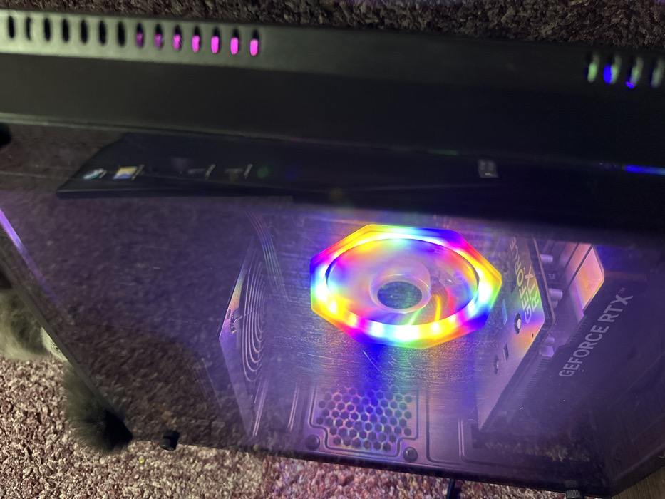 A computer case, likely for a gaming PC, is visible. It has a tempered glass side panel, allowing a view of the internal components. A cooling fan with RGB lighting is prominently featured. Part of a graphics card, labeled "GEFORCE RTX", is also visible. The case has ventilation holes and colored lights on top. The case sits on carpet. A piece of a gray animal, potentially a cat or dog, is on the left side of the frame.