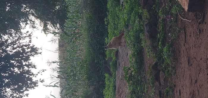 The image captures an outdoor agricultural scene in Kitonyoni, Kenya. A single, light brown domestic chicken is positioned centrally in the midground, oriented towards the right with its head lowered, suggesting foraging behavior on the reddish-brown earth. The immediate foreground consists of exposed, dry reddish-brown soil with scattered small, dark rocks and sparse green herbaceous growth. Behind the chicken, the ground is covered with denser green vegetation, and a dark, indistinct, low-lying object composed of irregular shapes is visible. The background features an extensive field of tall green maize (corn) plants, exhibiting mature stalks and tassels, extending towards a light-colored sky. The upper portion of the frame is dominated by the silhouetted foliage and branches of an overhead tree, obscuring the sky. The overall illumination indicates daytime conditions.