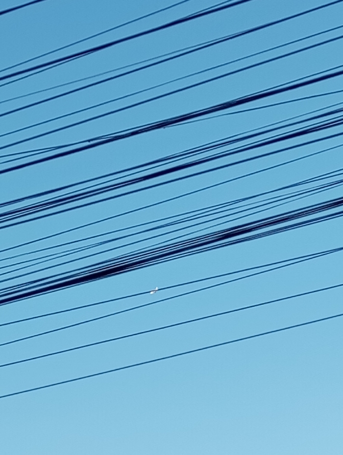 - "A bright, clear blue sky is crisscrossed by numerous black power lines running diagonally from the upper left to the lower right" by FM-iEAFO2, licensed under CC BY 4.0