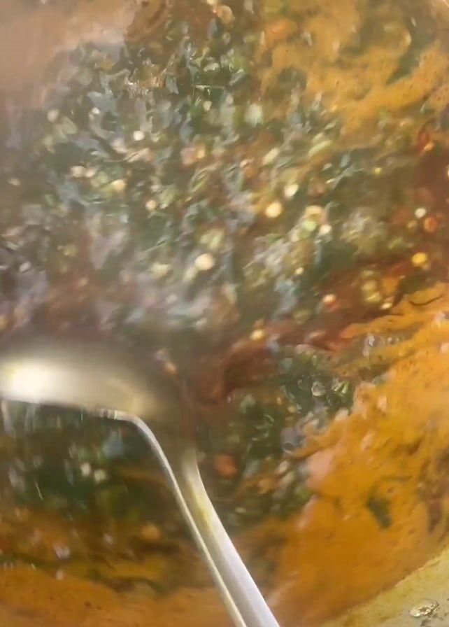 A close-up shot shows a metal pot filled with a dark, bubbling stew-like substance. The stew has a mix of greens, brown-orange liquid, and some small white solids floating within it. A large metal spoon stirs the stew, creating ripples and swirls in the liquid. The camera remains stationary, focusing on the pot and its contents. The background is out of focus, but appears to be an outdoor setting.