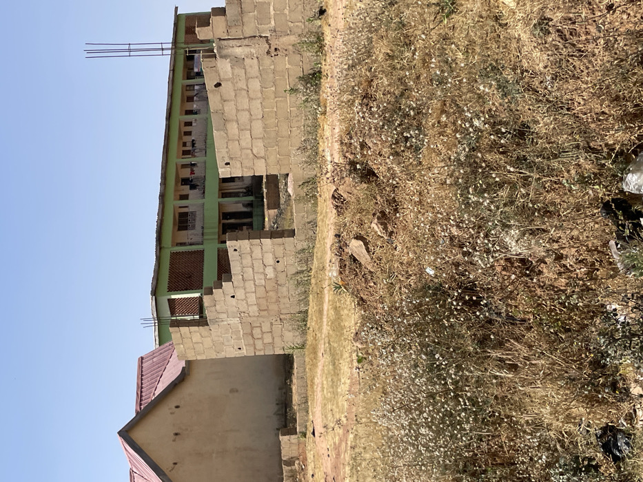 This image, taken in Gura Top, Nigeria, depicts an outdoor scene under a clear blue sky. The foreground features a dry, unpaved terrain covered with withered brown grass and weeds displaying small white florets. Scattered refuse, including black and white plastic debris, is visible at the very bottom, alongside a low mound of reddish soil and rocks. In the midground, a partial structure made of light brown concrete blocks forms a low wall with a central gap. Beyond this wall, the ground is similarly dry and unkempt. In the background, two buildings are prominent: to the left, a single-story structure with light beige walls and a reddish-brown corrugated metal gable roof; to the right, a two-story building painted light green. This two-story building has a flat roof with exposed rebar extending upwards on its right side, suggesting ongoing construction or an unfinished state. The upper floor features multiple windows with white railings along a balcony, from which several items of laundry are hanging to dry. Some upper-level openings also exhibit brown patterned screens. No people are visible, and no actions or interactions are depicted.