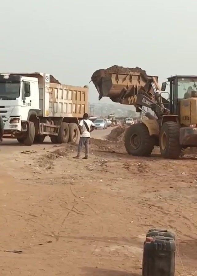 construction scene. A yellow front loader is filling a white dump truck with dirt or soil. A person in a white shirt stands near the truck, potentially guiding the loader operator. Another man in a gray shirt walks away from the truck and loader. The ground is dirt and partially paved. Some other vehicles are visible in the background. The video is slightly shaky. A black container sits in the foreground near a sign post.