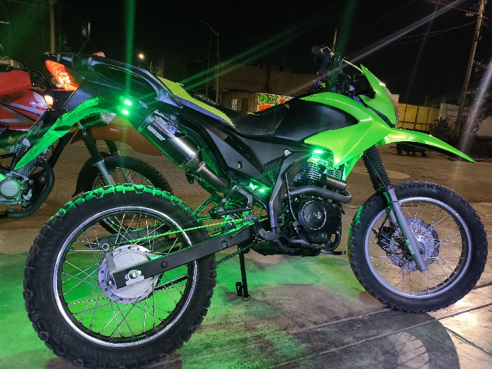 A black and neon green dual-sport motorcycle is parked on a concrete surface at night in the city of Trujillo, Peru
