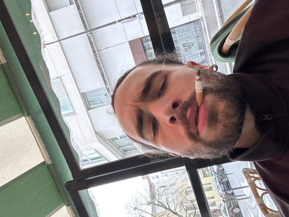 The image presents a close-up, slightly low-angle perspective of a male individual seated at what appears to be an outdoor cafe in Boulogne-Billancourt, France. The subject, a man with dark hair pulled back, a full beard, and prominent eyebrows, occupies the majority of the frame. He wears a dark, possibly black, zip-up top and has a small, dark hoop earring in his left ear. A lit cigarette, with a visible filter and glowing ember, is held between his lips, and he is looking directly at the camera. Above the man, a green and white striped awning of the establishment is visible, alongside a black structural beam or window frame. To the man's right, part of a light-colored, possibly rattan or wicker, chair is visible. Through the window or opening behind the man, an urban street scene in Boulogne-Billancourt is depicted. The background features multi-story, light-colored residential or commercial buildings across the street, characterized by numerous windows, some with external shutters or blinds. On the left, several parked cars and bare trees are visible along the street. A tall, dark street pole and a circular red and white street sign are present on the right side of the background. The sky appears overcast.