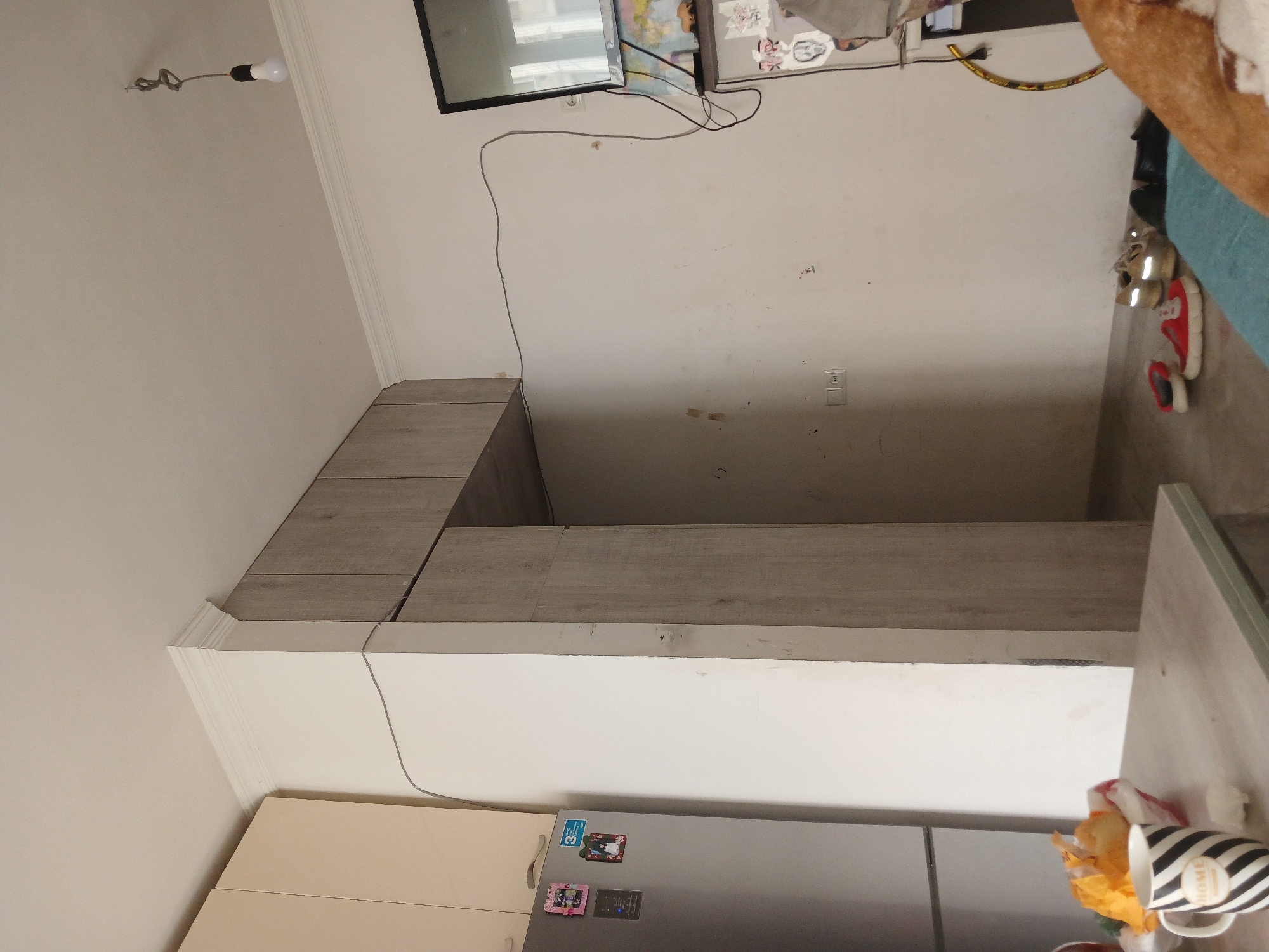 interior of an apartment or house. The scene includes a section of the ceiling with a light bulb, a wall-mounted television, a combination of closed and open storage units with light-colored wood grain doors, and a refrigerator with magnets attached. There are miscellaneous objects scattered around, including shoes, a yellow cable, and a cup. Based on the style of architecture and decor, it is most likely that the photo was taken somewhere in Tbilisi, Georgia. No people are visible.