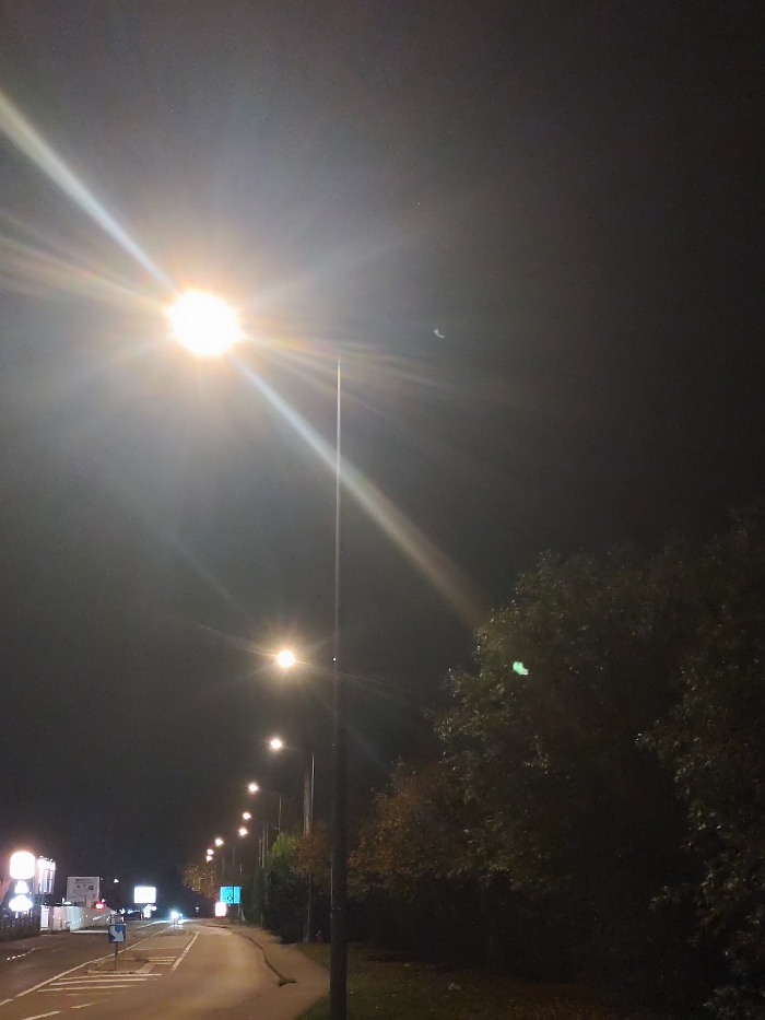 A nighttime scene shows a row of streetlights illuminating a road. The nearest light is intensely bright, creating a starburst effect. Trees line the right side of the road, their forms only faintly visible in the darkness. Further down the road, additional lights glow, suggesting a commercial area with signs and possibly buildings. The sky is a dark expanse, punctuated only by the artificial lights below.