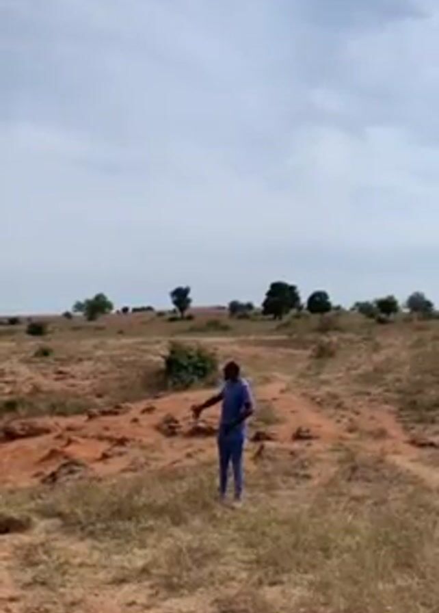 man standing in a dry, open landscape. The ground is reddish-brown and uneven. There are patches of dry grass and a few scattered trees. The sky is overcast with a mix of blue and gray clouds. The man is wearing a blue uniform and is pointing towards the landscape. As the camera pans to the left, a distant white car appears on the horizon.
