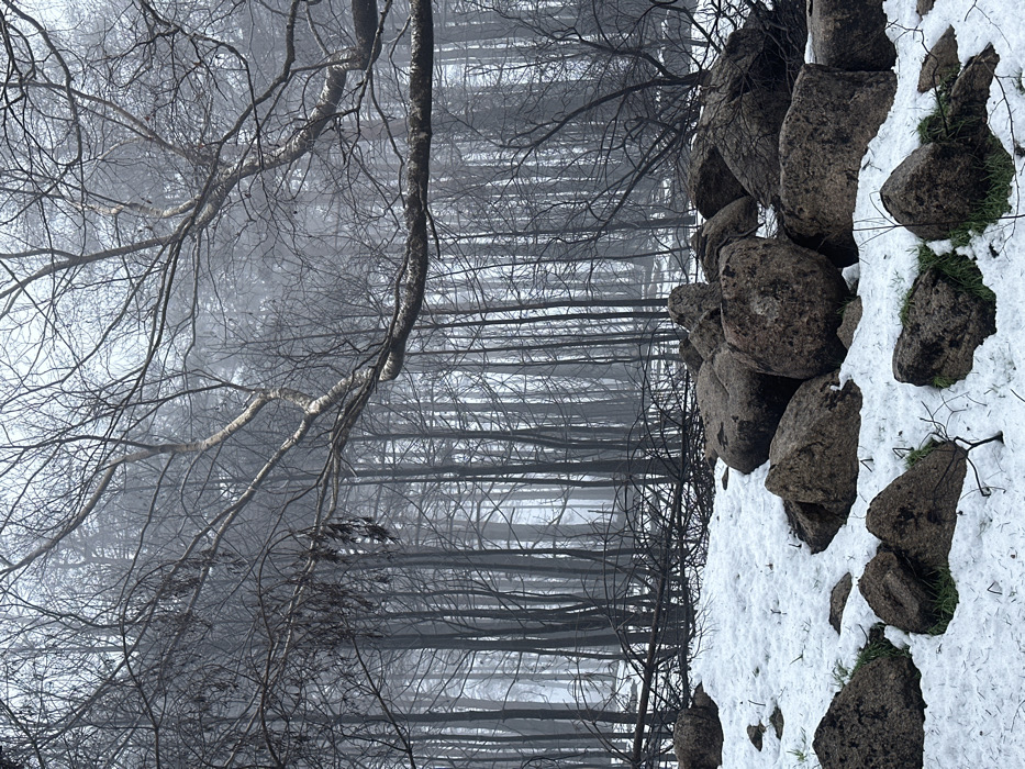 A vertical shot shows a winter landscape featuring a dense forest. Leafless trees fill the background, shrouded in mist, creating a sense of depth. To the right, large rocks scattered with snow and small patches of green plants add texture and contrast. Bare branches reach into the frame from the left. The image conveys a cold, quiet, and somewhat desolate atmosphere.