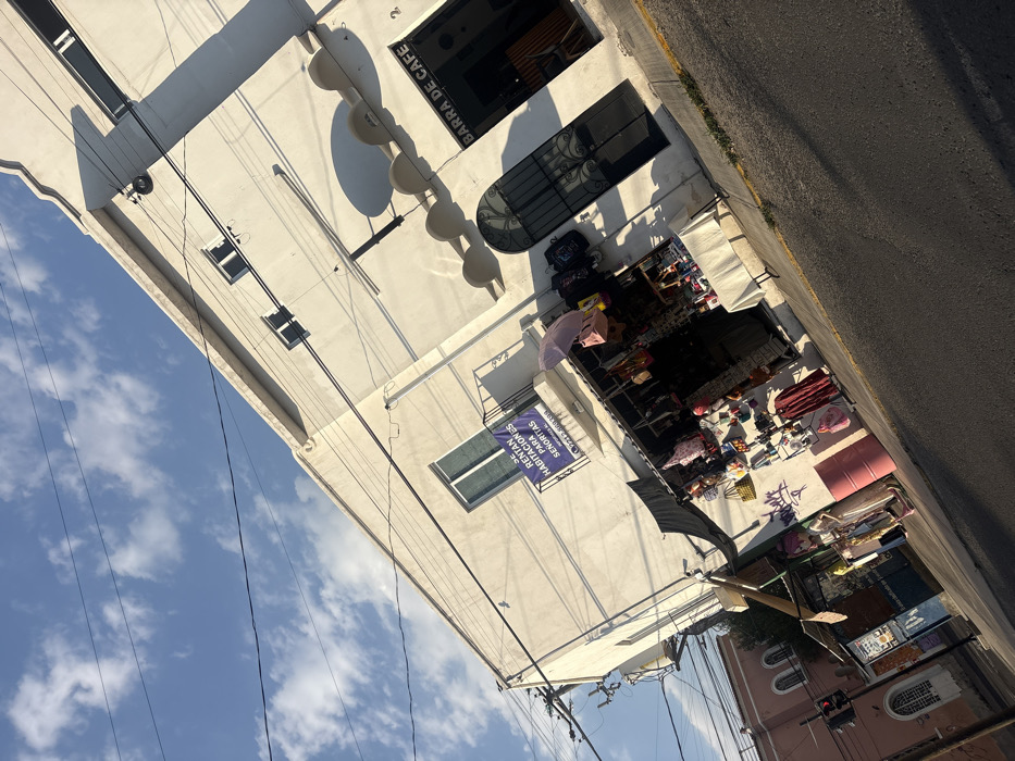 This image depicts a tilted, sunlit street view in Puebla, Mexico, under a blue sky with scattered white clouds. The central feature is a two-story, off-white stucco building. The upper floor exhibits three rectangular windows. A small balcony, equipped with a metal railing, displays a blue banner with white text that reads "SE RENTAN HABITACIONES PARA SEÑORITAS" (Rooms for rent for young ladies) and includes a phone number. The ground floor of the building accommodates commercial establishments. On the right, an entrance with a dark, ornate metal gate and an overhead sign identifying it as "BARRA DE CAFE" (coffee bar) is visible. To the left of this entrance, five curved, decorative architectural elements are affixed to the building's facade. Further left, a street vendor's stall is set up against the building, covered by a black awning. Various merchandise, including handbags, accessories, and clothing items, are displayed on racks and tables. A light purple open umbrella is positioned above part of the stall's display. Graffiti is present on the lower section of the building's wall next to the stall, and a pink metal barrel stands on the sidewalk. Two indistinct human figures are partially visible near the vendor's stall. The foreground shows a dark asphalt street with visible tire marks. Numerous black utility lines traverse the sky and connect to the building. In the background on the far left, a portion of a reddish-brown building with arched windows is visible, alongside a red traffic light and a utility pole. Strong sunlight casts sharp shadows from the utility lines and building features.