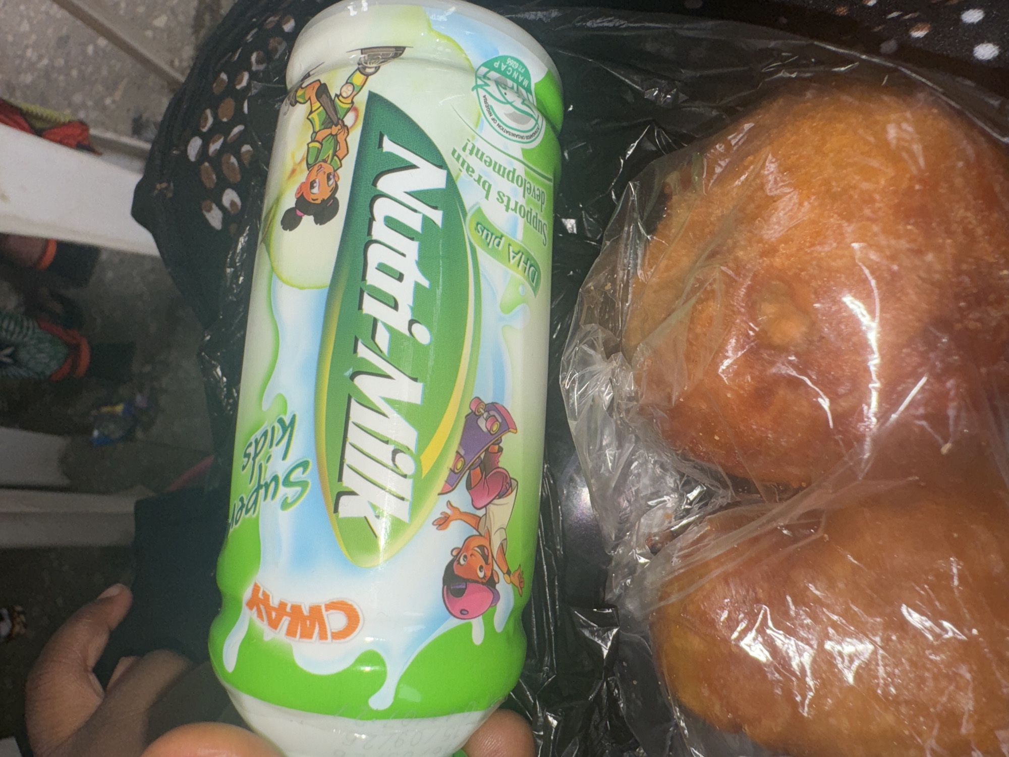 bottle of Nutri-Milk Super Kids, a children's milk drink produced by CWAY, next to a plastic bag containing what appears to be fried dough or pastries