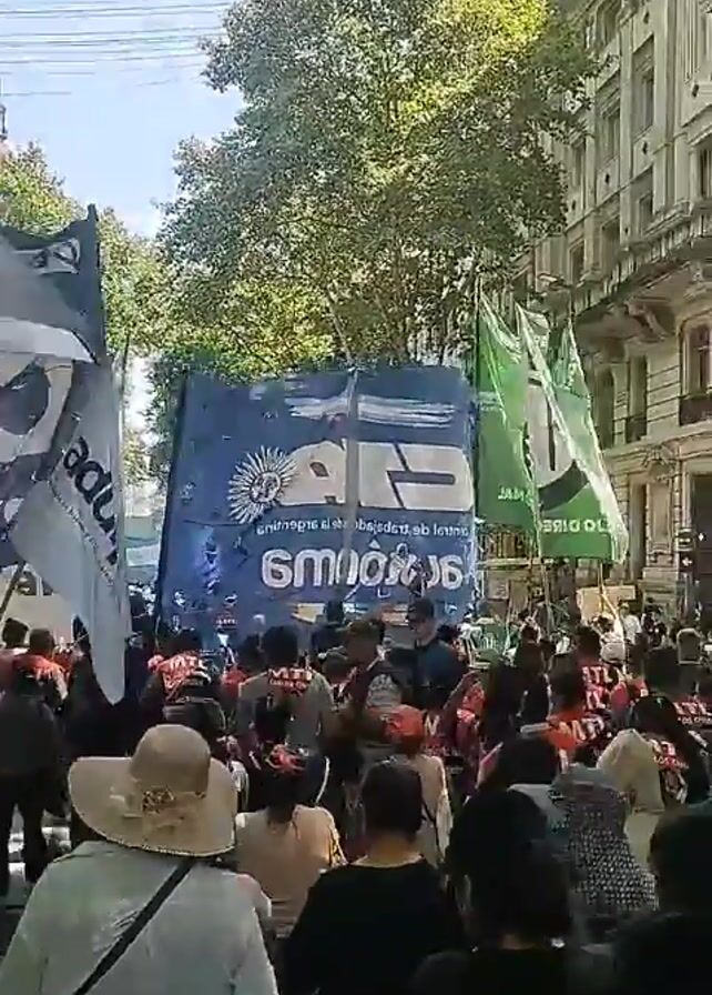 A crowd of people are gathered on a city street, possibly for a demonstration or march. The group is diverse, with people of different ages and ethnicities. Some individuals are carrying flags, banners, and signs with messages. One large banner reads "CTA" (Central de Trabajadores de Argentina - Workers' Central Union of Argentina). There is a marching band playing drums. The buildings around the crowd are old and have European-style architecture. The weather appears to be sunny and pleasant, and trees line the street. The crowd is moving in a procession, and it seems to be an organized event.