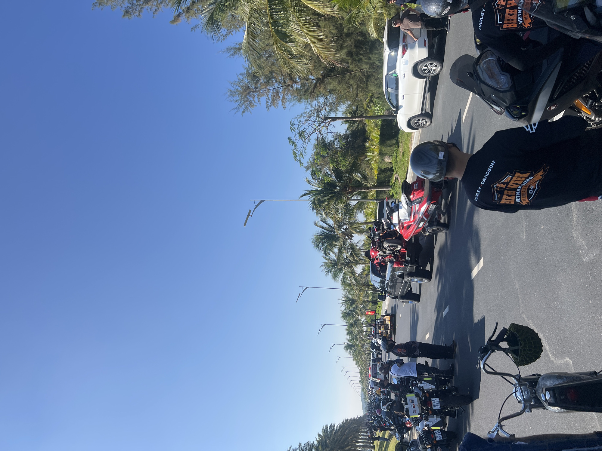 This image depicts a large gathering of individuals and vehicles on a wide, multi-lane asphalt road in Cam Ranh, Vietnam, under a clear blue sky. The scene appears to be a motorcycle event or rally. In the foreground and left mid-ground, numerous motorcycles are parked or stationary, primarily on the left side of the road. Many riders, predominantly male, are present, some wearing helmets and dark long-sleeved shirts bearing "HARLEY-DAVIDSON" and "BIKE WEEK VIETNAM 2023" logos. One motorcycle in the immediate foreground, seen from behind the handlebars, has a decorative, moss-like object attached to its front. Motorcycles further back display visible Vietnamese license plates. In the middle of the road, a dark-colored pickup truck with large tires is towing a trailer. The trailer carries two red personal watercraft (jet skis) and other equipment. To the right of the pickup truck, a white SUV (resembling a Toyota Fortuner) is stationary on the road's shoulder or lane, with a man in a brown shirt standing beside its rear. The road is lined with numerous tall palm trees on both sides, particularly dense on the left and right. Beyond the palm trees, lush green foliage and other trees are visible. Modern streetlights are spaced along the road. The clear sky indicates fair weather conditions during daylight hours. People are observed standing, some conversing, with no overt actions of rapid movement or distress. The overall impression is one of a large, organized procession or gathering.
