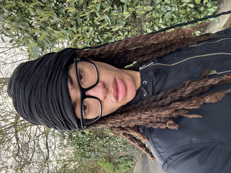 Located in Orsay, France, the image depicts a frontal, chest-up portrait of an individual. The person has dark skin, wears a textured black headwrap and black-framed eyeglasses. Long, brown dreadlocks cascade over their shoulders and chest. They are dressed in a black, zippered jacket with metallic zipper and stitching details. The individual presents a neutral expression, gazing directly at the viewer, with lips slightly parted. The background on the left features paved ground and deciduous trees with budding branches. On the right, a dense green hedge exhibits light green floral structures.