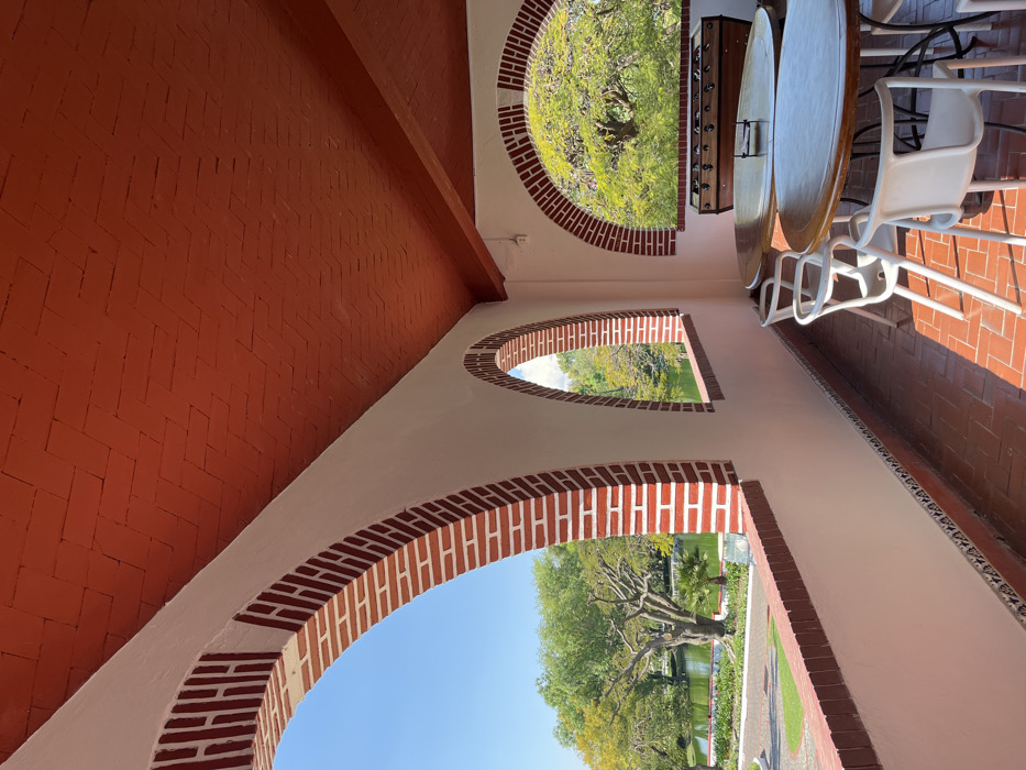 A covered patio shows three archways leading to an outside area with trees and a small lake. The arches are trimmed with red and white brick, matching the patio floor and one wall. A tan-colored wall separates the arches. The patio contains two round wooden tables, white plastic chairs, and a wooden cabinet with glassware. The scene has ample sunlight.