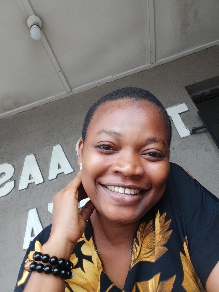 A Black woman is depicted in a close-up, selfie-style photograph, smiling broadly directly into the camera. She has short, dark hair and is wearing a black top with a distinctive gold and yellow leaf or feather pattern. A double-strand bracelet made of large black beads adorns her left wrist, and a small, light-colored stud earring is visible in her left ear. Her right hand is positioned with fingers lightly touching her jawline. The background consists of a textured, light-colored concrete wall featuring white, raised letters that are horizontally reversed, indicating the image is a selfie. Visible reversed letters include "SAAS" and "AY" below it, with a distinct "T" further to the right. Above, a light-colored, possibly white, suspended ceiling with visible seams is present, from which a single white LED bulb is mounted in a fixture in the upper left corner. The architectural style and signage are consistent with a storefront, office entrance, or similar structure in an urban or suburban area of Lagos, Nigeria.